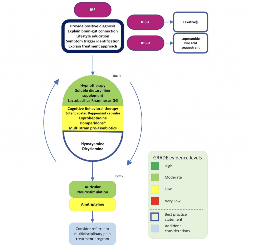 ESPGHAN/NASPGHAN guidelines for treatment of irritable bowel syndrome and functional abdominal pain‐not otherwise specified in children aged 4–18 years — первое совместное руководство Европейского общества детской гастроэнтерологии, гепатологии и питания и Североамериканского общества детской гастроэнтерологии, гепатологии и питания по лечению хронической боли в животе. Разработано на основе 86 РКИ и согласно Римским критериям IV, обсуждаются различные типы расстройств взаимодействия кишечник-мозг (disorders of gut-brain interaction) — синдром раздраженного кишечника, функциональная абдоминальная боль, функциональная диспепсия и др. Главный вывод — наиболее сильную доказательную базу имеет психотерапия, направленная на ось «кишечник — мозг» (gut-brain psychotherapies): прежде всего, гипнотерапия, КПТ и методы релаксации. А многие рутинно применяемые препараты имеют слабую «педиатрическую» доказательную базу или не имеют ее вовсе.