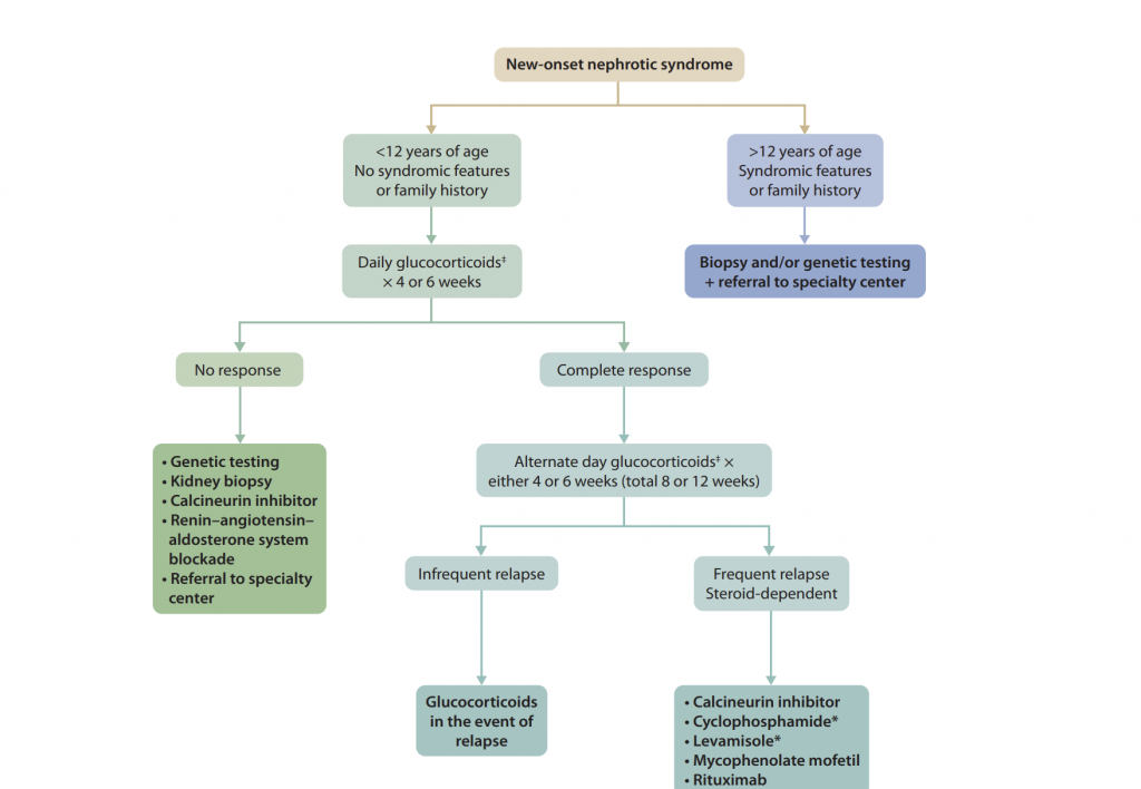 KDIGO: Clinical Practice Guideline for the Management of Nephrotic Syndrome in Children 2025 — фокусное обновление соответствующей главы по гломерулярным заболеваниям руководства KDIGO Glomerular Diseases 2021 (организация Kidney Disease: Improving Global Outcomes). В обновлении уточнены определения нефротического синдрома и рецидива, добавлен алгоритм, поясняющий, когда делать биопсию и/или генетическое тестирование, конкретизирован выбор иммуносупрессии при steroid-sensitive NS (cтероид-чувствительном нефротическом синдроме), steroid-dependent NS (стероид-зависимом нефротическом синдроме), steroid-resistant NS (cтероид-резистентном нефротическом синдроме), отсроченном ответе на терапию.